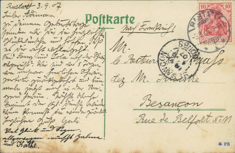 Alte Ansichtskarte aus Rastatt, gelaufen am 03.09.1907 von Rastatt nach Besancon.
