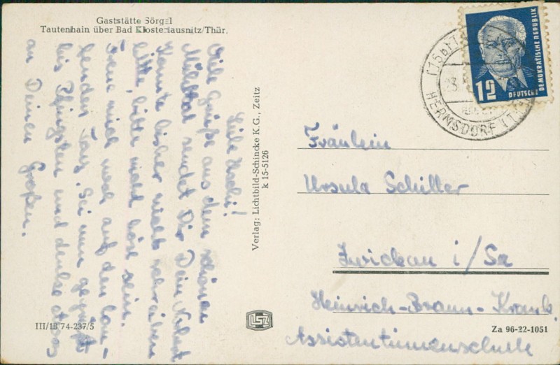 Alte Ansichtskarte aus Tautenhain (Bad Klosterlausnitz), gelaufen um 1960.