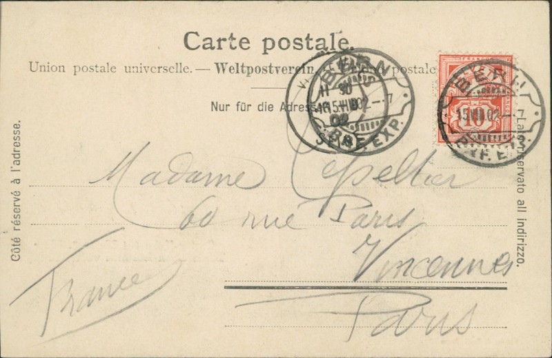 Alte Ansichtskarte aus Gurten, gelaufen am 15.08.1902 von Bern nach Vincennes.