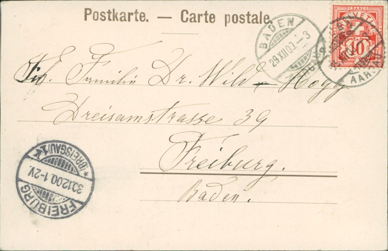 Alte Ansichtskarte aus Baden AG, gelaufen am 29.12.1900 von Baden nach Freiburg. Ankunft in Freiburg am 30.12.1900.
