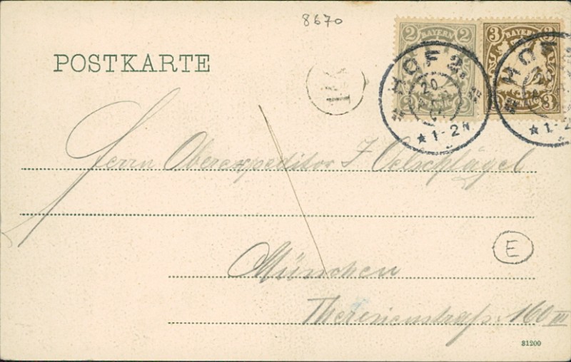 Alte Ansichtskarte aus Hof, gelaufen am 20.04.1904 von Hof nach München.