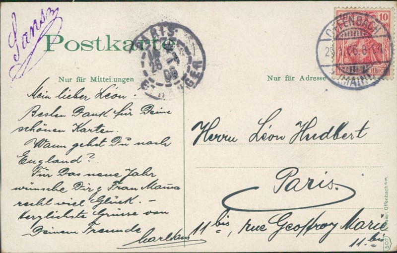 Alte Ansichtskarte aus Offenbach am Main, gelaufen am 25.01.1906 von Offenbach nach Paris. Ankunft in Paris am 26.01.1906.
