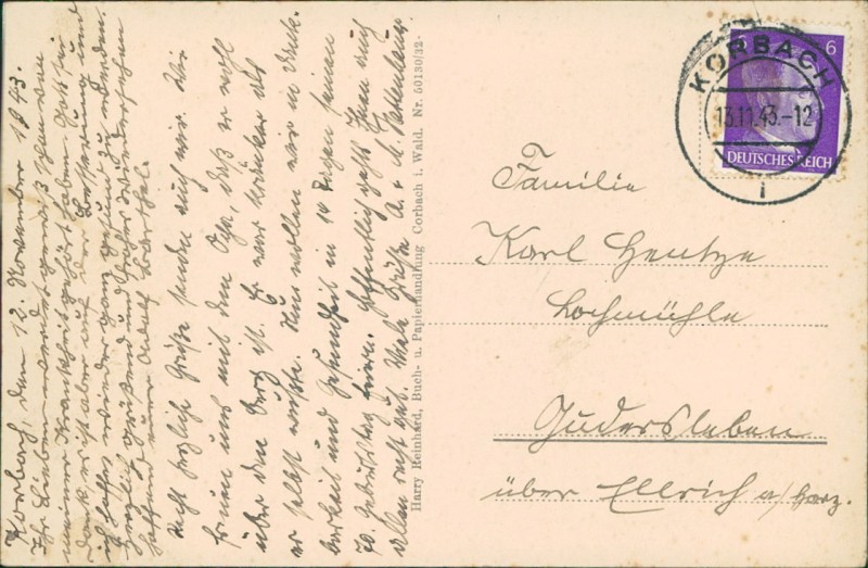 Alte Ansichtskarte aus Korbach, gelaufen am 13.11.1943.