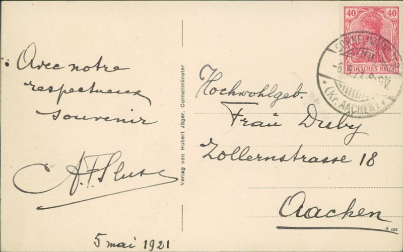 Alte Ansichtskarte aus Aachen-Kornelimünster, gelaufen am 06.05.1921 von Cornelimünster (Kr. Aachen) nach Aachen.