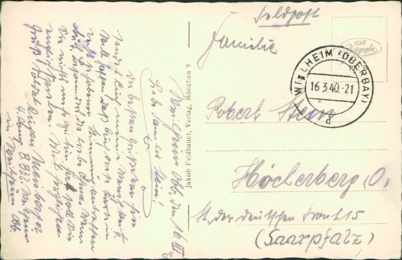 Alte Ansichtskarte aus Weilheim i.OB, gelaufen am 16.03.1940 von Weilheim (Oberbay.) nach Höcherberg.