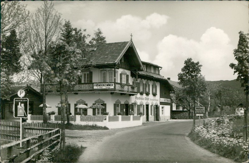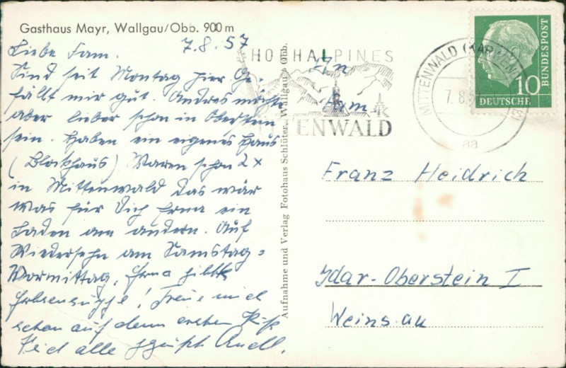 Alte Ansichtskarte aus Wallgau, gelaufen am 07.08.1957 von Mittenwald nach Idar-Oberstein.