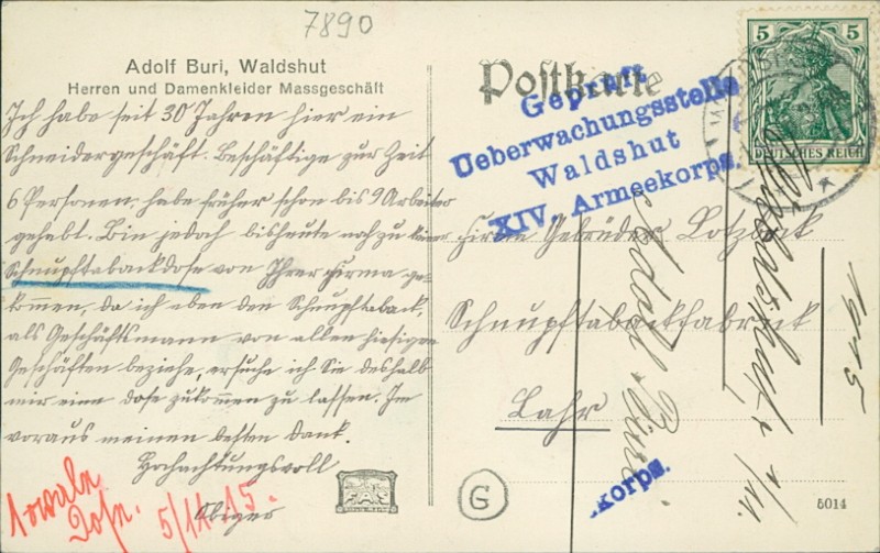 | Stempel | Waldshut (Stempel Geprüft Ueberwachungsstelle Waldshut XIV. Armeekorps) |