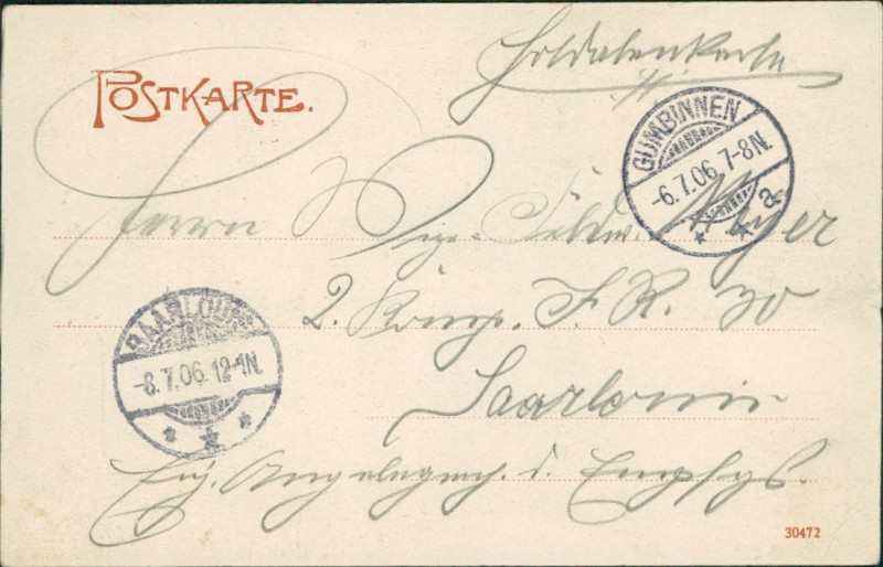 Alte Ansichtskarte aus Gumbinnen / Gussew, gelaufen am 06.07.1906 von Gumbinnen nach Saarlouis. Ankunft in Saarlouis am 08.07.1906.