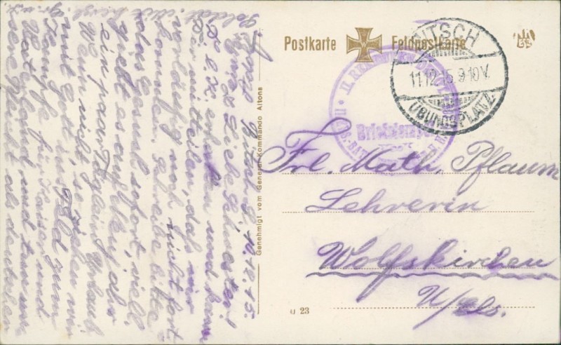 Alte Ansichtskarte, gelaufen am 11.12.1915 von Bitsch Übungsplatz nach Wolfskirchen U/Els.