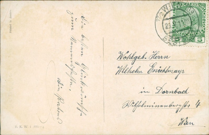 Alte Ansichtskarte, gelaufen am 23.05.1911 von Wien nach Dornbach.