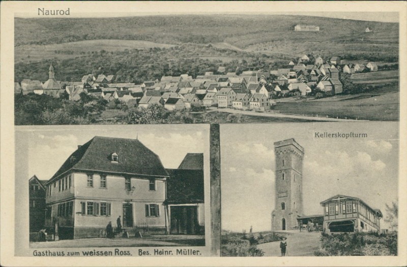 Gesamtansicht, Gasthaus zum weissen Ross. Bes. Heinr. Müller, Kellerskopfturm