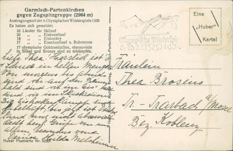Alte Ansichtskarte aus Garmisch-Partenkirchen, gelaufen um 1936.