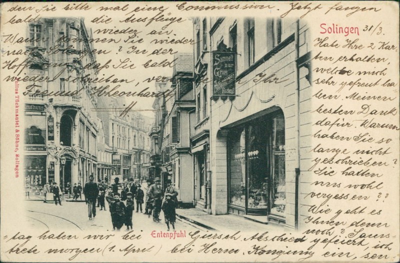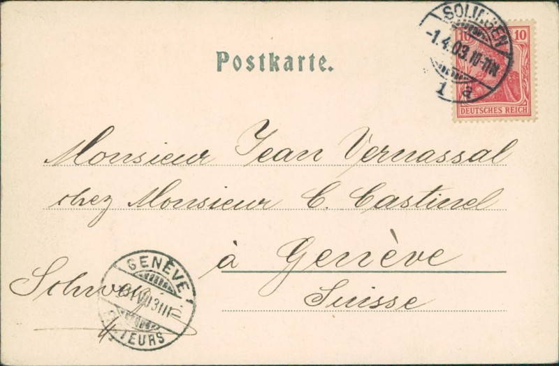 Alte Ansichtskarte aus Solingen, gelaufen am 01.04.1903 von Solingen nach Genève. Ankunft in Genève am 03.04.1903.