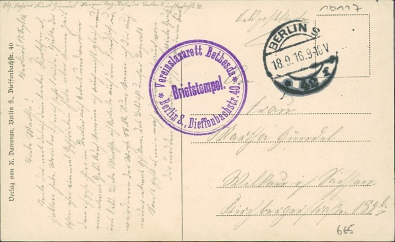 | Stempel | Berlin (Briefstempel Vereinslazarett Bethesda, Berlin S., Dieffenbachstr. 40) |