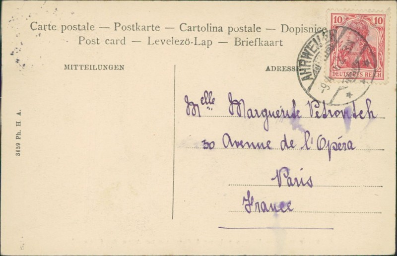 Alte Ansichtskarte aus Bad Neuenahr-Ahrweiler, gelaufen am 09.04.1906 von Ahrweiler nach Paris.