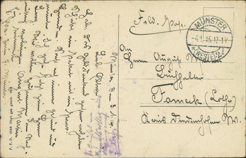 Alte Ansichtskarte aus Münster, gelaufen am 04.01.1915 von Münster (Westf.) nach Fameck.