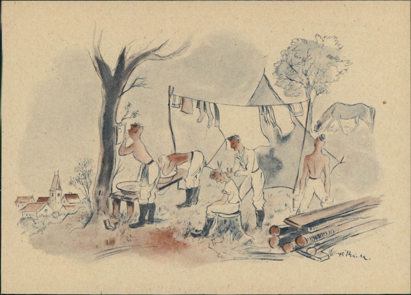 Katzenwäsche, Zeichnung Soldat H. Thiele
