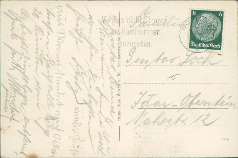 Alte Ansichtskarte aus Worms, gelaufen um 1934 von Worms nach Idar-Oberstein.