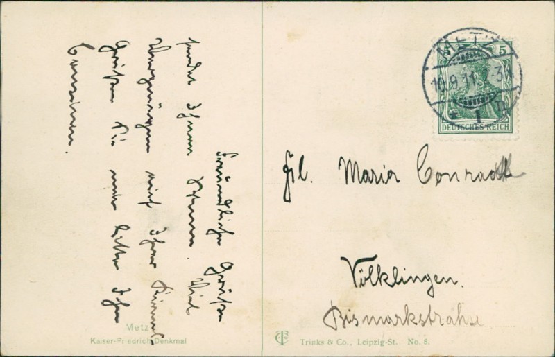 Alte Ansichtskarte aus Metz, gelaufen am 10.09.1911 von Metz nach Völkingen.