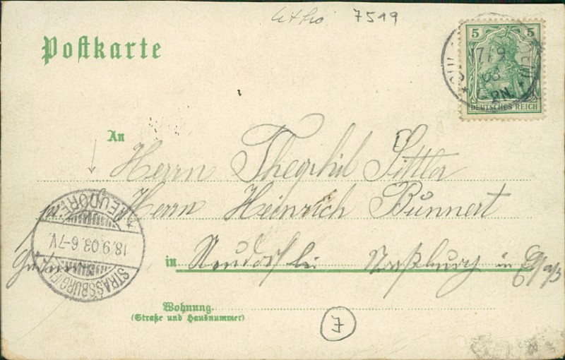 Alte Ansichtskarte aus Sulzfeld, gelaufen am 17.09.1903 von Sulzfeld nach Neudorf bei Straßburg im Elsaß. Ankunft in Neudorf bei Straßburg im Elsaß am 18.09.1903.