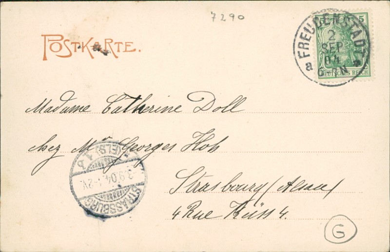 Alte Ansichtskarte aus Freudenstadt, gelaufen am 02.09.1904 von Freudenstadt nach Strasburg / Alsace. Ankunft in Strasburg / Alsace am 03.09.1904.