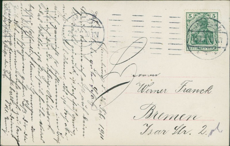 Alte Ansichtskarte, gelaufen am 25.02.1911 von Hamburg nach Bremen.