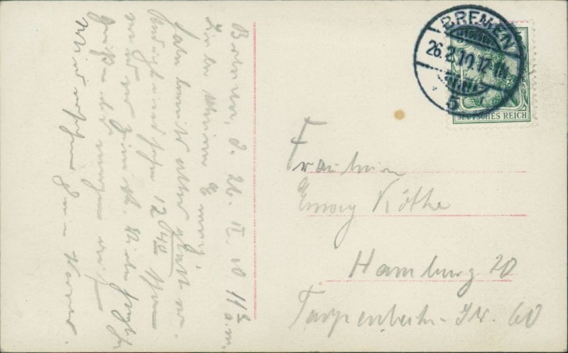 Alte Ansichtskarte, gelaufen am 26.02.1910 von Bremen nach Hamburg.