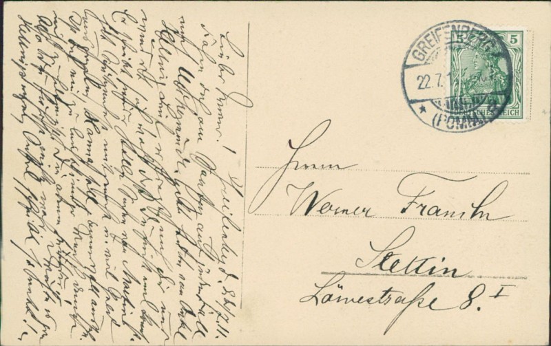 Alte Ansichtskarte aus Greifenberg / Gryfice, gelaufen am 22.07.1911 von Greifenberg (Pomm.) nach Stettin.