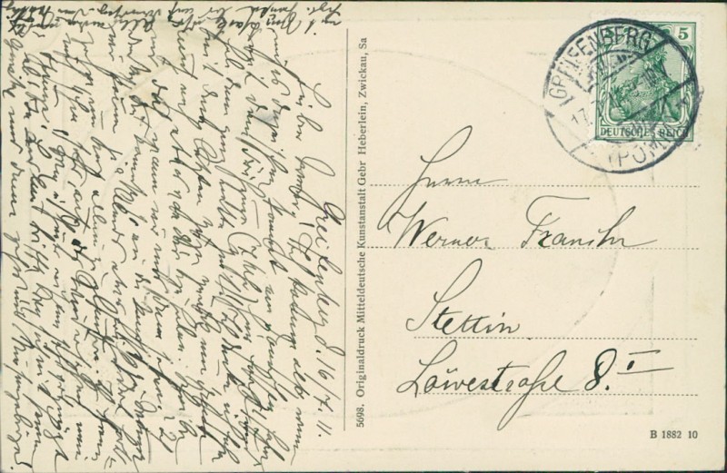 Alte Ansichtskarte aus Greifenberg / Gryfice, gelaufen am 17.07.1911 von Greifenberg (Pomm.) nach Stettin.