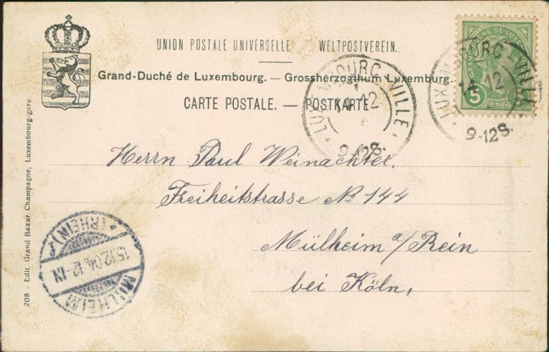 Alte Ansichtskarte aus Luxembourg, gelaufen am 14.12.1904 von Luxembourg nach Mülheim a/Rhein. Ankunft in Mülheim a/Rhein am 15.12.1904.