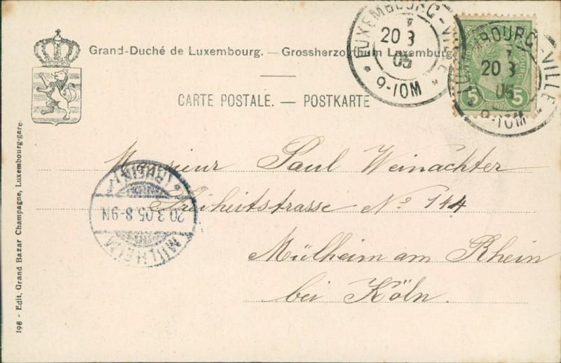 Alte Ansichtskarte aus Luxembourg, gelaufen am 20.03.1905 von Luxembourg nach Mülheim am Rhein. Ankunft in Mülheim am Rhein am 20.03.1905.