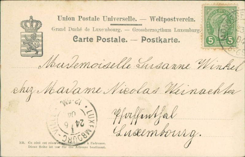 Alte Ansichtskarte aus Mondorf-les-Bains, gelaufen am 23.06.1904 von Mondorf-les-Bains nach Luxembourg. Ankunft in Luxembourg am 24.06.1904.