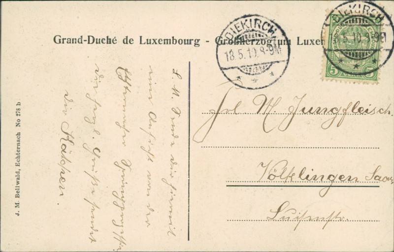 Alte Ansichtskarte aus Echternach, gelaufen am 18.05.1910 von Diekirch nach Völklingen.