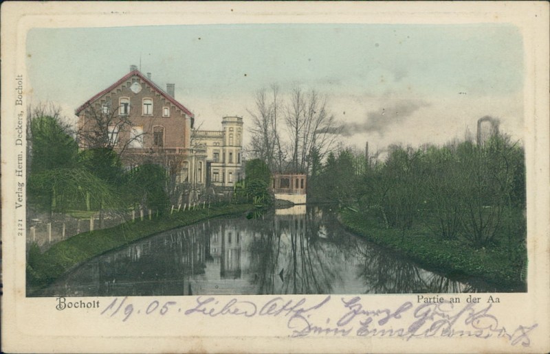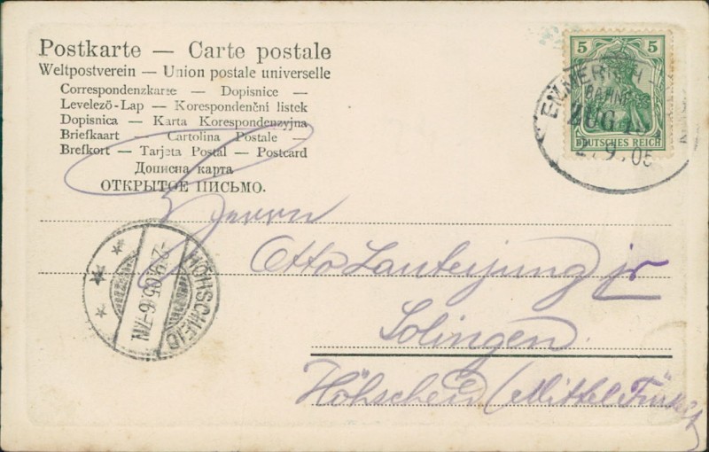 Alte Ansichtskarte aus Bocholt, gelaufen am 02.09.1905 von Emmerich-.. (Bahnpost) nach Solingen.