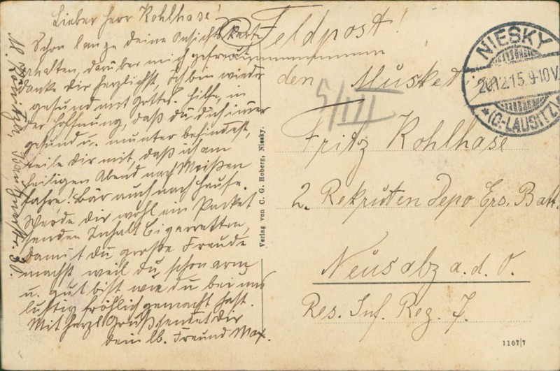 Alte Ansichtskarte aus Niesky, gelaufen am 20.12.1915 von Niesky (O.-Lausitz) nach Neusalz.