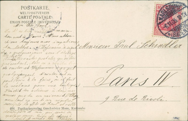 Alte Ansichtskarte aus Karlsruhe, gelaufen am 06.11.1905 von Karlsruhe (Baden) nach Paris.