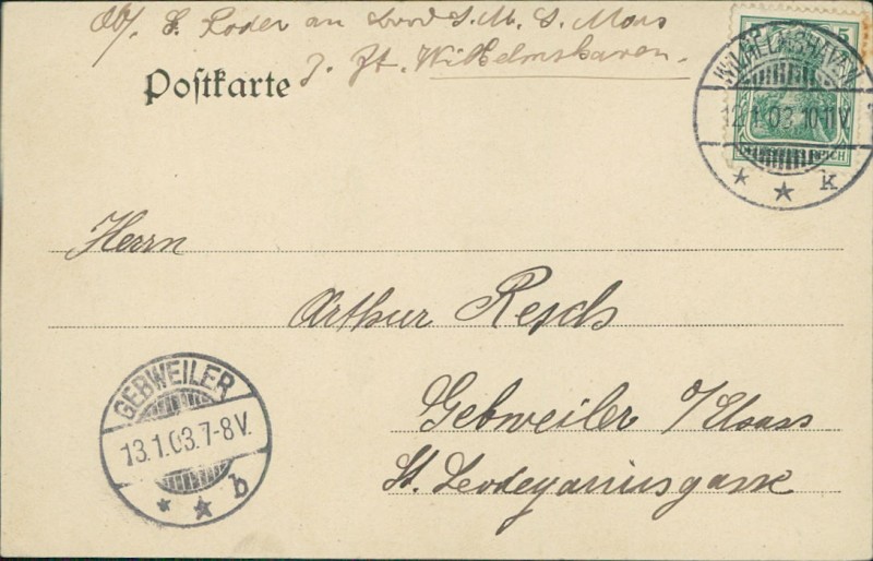 Alte Ansichtskarte, gelaufen am 12.01.1903 von Wilhelmshaven nach Gebweiler O/Elsass. Ankunft in Gebweiler O/Elsass am 13.01.1903.