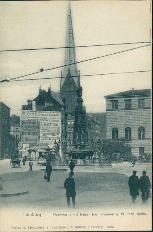 Fischmarkt mit Kaiser Karl Brunnen u. St. Petri Kirche, Straßenbahn