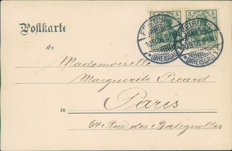 Alte Ansichtskarte aus Laupheim, gelaufen am 10.09.1906 von Freiburg (Breisgau) nach Paris.
