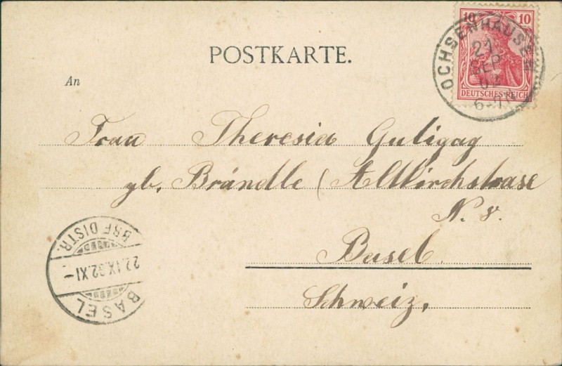 Alte Ansichtskarte aus Ochsenhausen, gelaufen am 21.09.1902 von Ochsenhausen nach Basel. Ankunft in Basel am 22.09.1902.