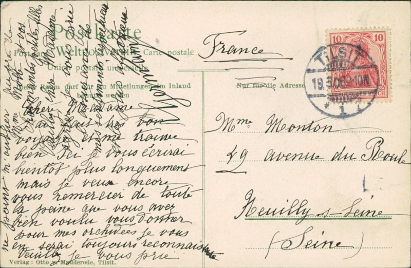 Alte Ansichtskarte aus Tilsit / Sowjetsk, gelaufen am 19.03.1906 von Tilsit nach Neuilly-s-Seine.