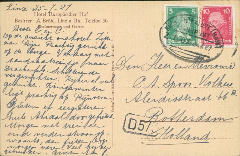 Alte Ansichtskarte aus Linz am Rhein, gelaufen am 25.07.1927.