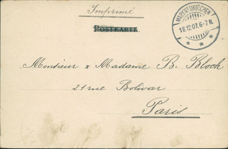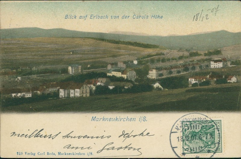 Alte Ansichtskarte aus Markneukirchen, gelaufen am 18.12.1907 von Markneukirchen nach Paris.