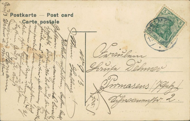Alte Ansichtskarte aus Delme, gelaufen am 11.09.1913 von Delme nach Pirmasens.