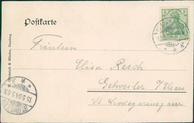Alte Ansichtskarte aus Helgoland, gelaufen am 12.05.1904 von Helgoland nach Gebweiler O/Elsass. Ankunft in Gebweiler O/Elsass am 15.05.1904.