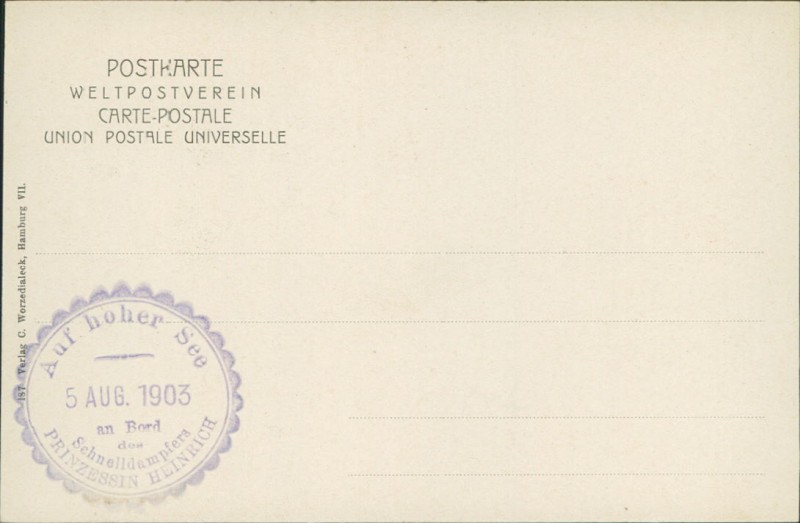 Totalansicht, rückseitig Stempel "Auf hoher See. An Bord des Schnelldampfers Prinzessin Heinrich"