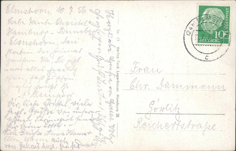 Alte Ansichtskarte aus Elmshorn, gelaufen am 11.07.1956 von Elmshorn nach Görlitz.