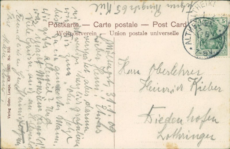 Alte Ansichtskarte aus Möltenort, gelaufen am 01.02.1909 von Altheikendorf nach Diedenhofen.