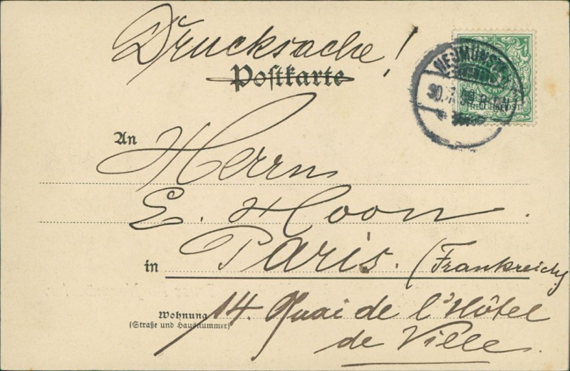 Alte Ansichtskarte aus Neumünster, gelaufen um 1899 von Neumünster nach Paris.