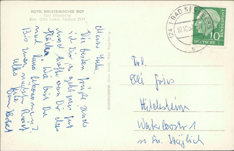 Alte Ansichtskarte aus Bad Segeberg, gelaufen am 10.10.1957 von Bad Segeberg nach Hildesheim.